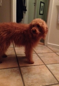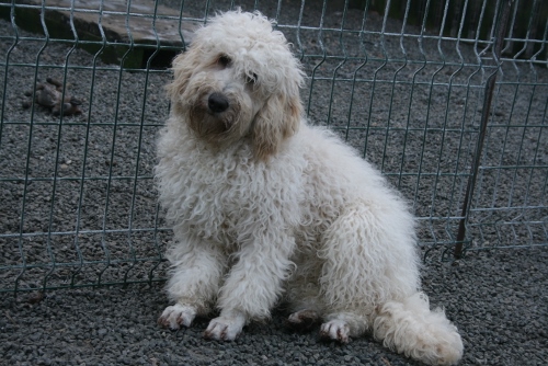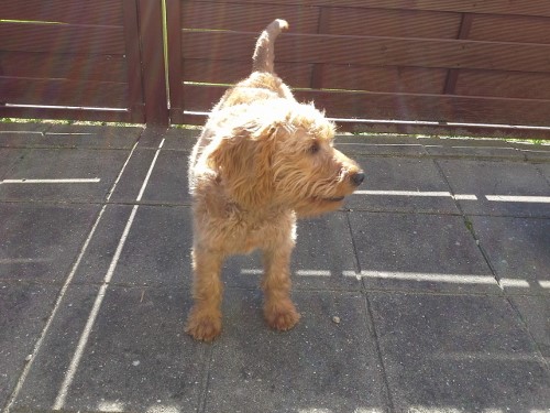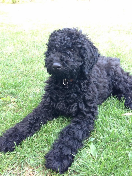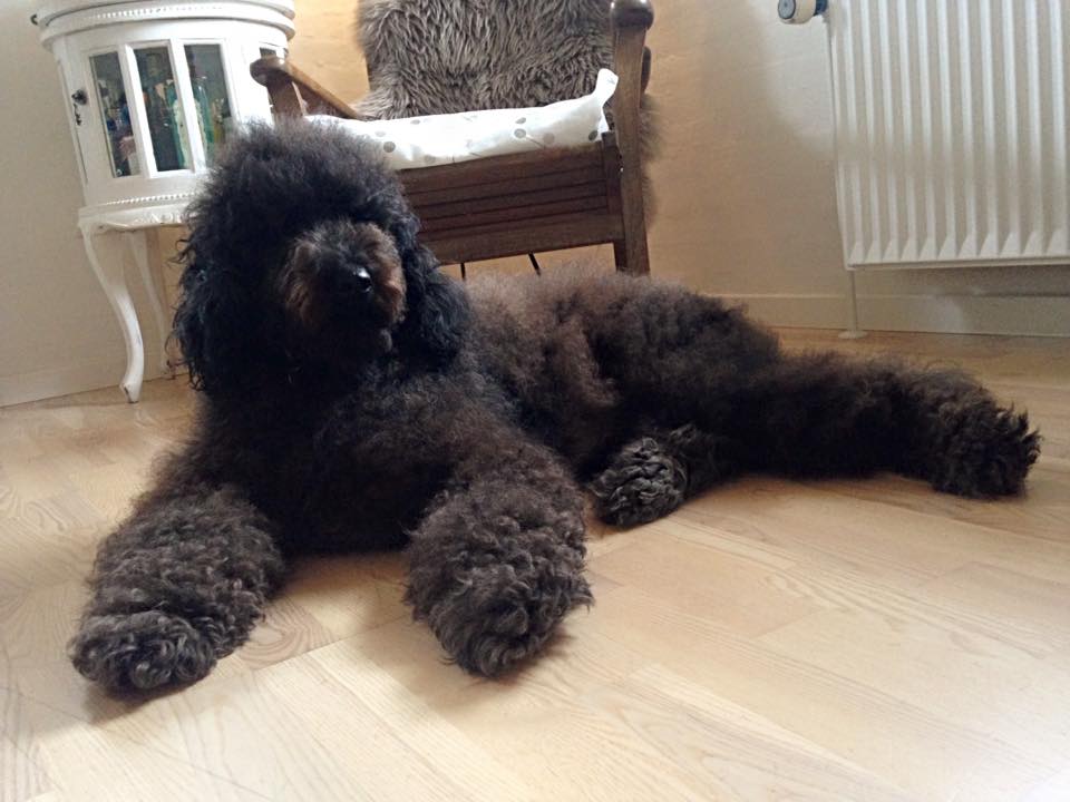 Luna har det rigtig godt.Hun er en dejlig hund, som vier meget glade for. Hun er ca. 45 cmhøj ved skulder, 70 cm lang (ex hale) og vejer knap 10 kg. Hun har kraftig pels med masser af krøller og fantastisk flot mørk cognacsfarve.Pelsen vokser ikke noget særligt. Vi børster hende jævnligt. Så det har ikke været nødvendigt at få hende klippet.