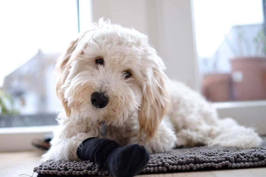 Fra første nat har hun sovet igennem, hun er alene ca. 4-5 timer om dagen og det går super. Ingen ødelagte ting, bare hun har sine bamser og får tyggeting. I dag fik hun ben fra slagteren, det var lykken – nu er vi lidt spændte på om maven kan klare det….
