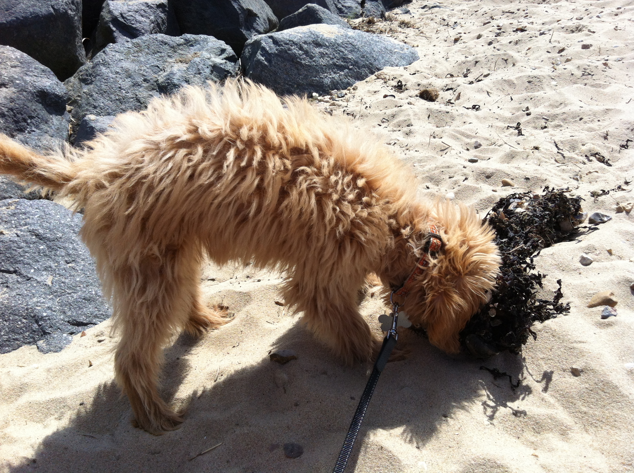 På to andre billeder er jeg på Sædding Strand / Esbjerg – bliver man sulten kan tang anbefales – ellers er det jo dejligt at ligge under parasollen – indtil man får øje på en anden hund ude i horisonten …
