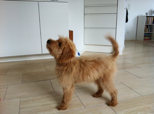 Han har det godt, spiser, leger og er lidt fræk men har endnu ikke lavet ulykker. Desværre har jeg ikke fundet et hold hvalptræning endnu så jeg træner ham selv lidt.