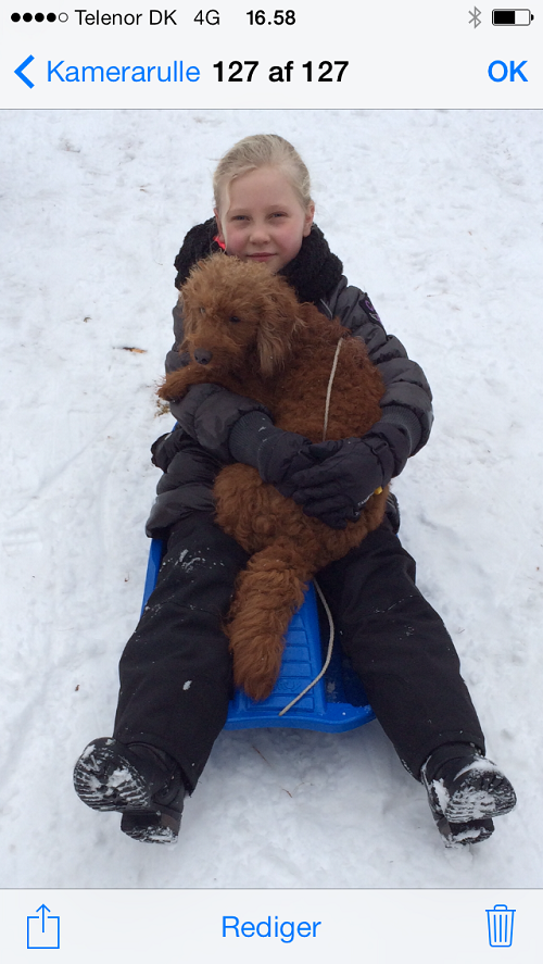 Hej. Hurra, i dag er Milwa 2 år! Hun er stadig den skønneste hund man kan tænke sig. Hun er ca 50 cm over ryggen, vejer ca 11 kg, helt perfekt størrelse til os. Mht. Allergi: selvom jeg har allergi for hunde, kløe i øjne, nyser og vejrtrækningsbesvær har jeg IKKE oplevet nogen gener overhovedet med Milwa. Hun er utrolig nem at “styre”, er altid glad og venlig overfor både mennesker og andre hunde. Hun fælder ikke men pelsen bliver redt jævnligt og derved bliver de døde hår trukket af hende, det har været super nemt at få hende selvom hun er vores første hvalp! Tak for hende, jeg kan kun anbefale alle at få en doodle fra jer 😉 mange hilsner fam. Watson