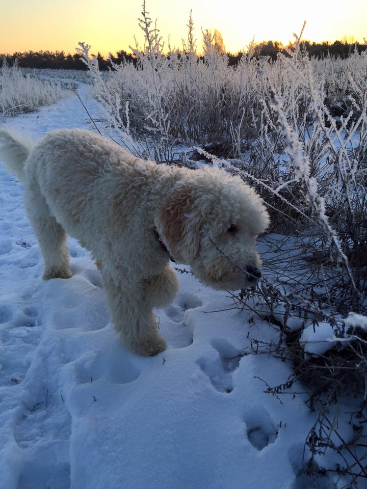 Det var koldt her til morgen og det havde sneet en del, så det har givet lidt problemer med at få Bertam til at tisse udenfor, sneen er for højt for ham at gå i, men jeg må bare blive ved med at prøve.