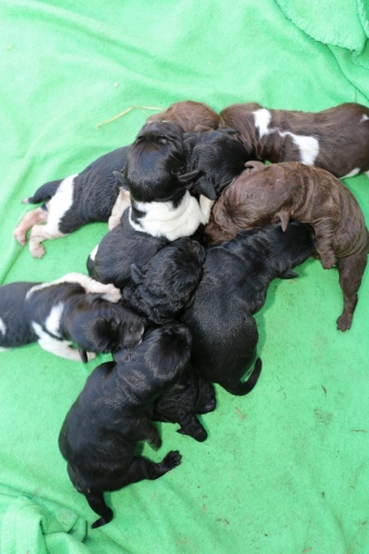 Der kom 1 sort tæve, 2 sort/hvid tæve, 1 brun tæve og 1 brun/hvid han….så 5 levende hvalpe.