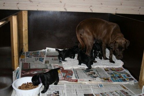 Så har hvalpene fået lidt mere plads. De er taget ud af fødekassen. De begynder nu at gå lidt rundt i rummet, mest for at finde mælkebaren molly, lidt tilfældigt og ikke helt planlagt gåture, de ser nemmelig stadig rigtig dårligt så de kommer nemt til at løbe for langt væk og kan ikke selv finde tilbage til tæppet, så lige nu er der sat en forhindring op som holder lidt på dem, om ca en uges tid fjerner vi afskærmningen og så har de hele rummet. De sover og spiser stadig 99% af tiden, så meget andet bliver det ikke til pt. Der skal nok komme mange flere billeder når de begynder at lege og i det hele tage begynder at være vågen.