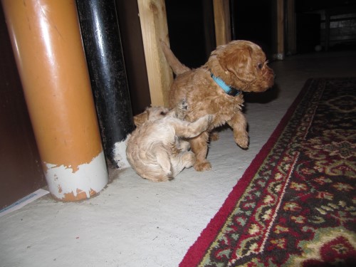 Hvalpene fra Coco og Paris går nu sammen hele tiden og deles om de to mælkebare 🙂 Så er der også flere legekammerater.