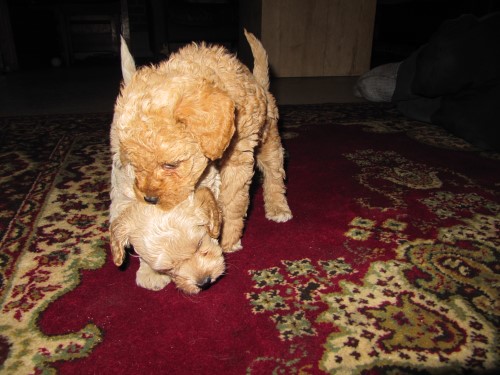 Vores første kuld Labradoodles F1B skal vi lave med vores lille gyldne mini/mellem Labradoodle “Paris” og vores lyse mellem pudlen Ozzy.