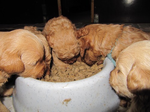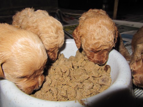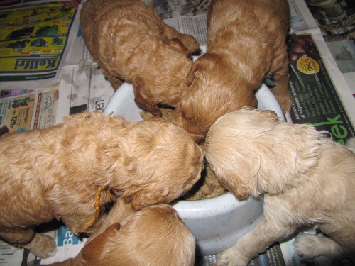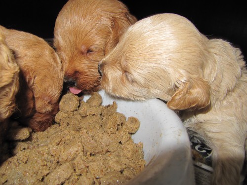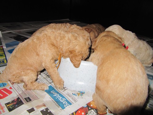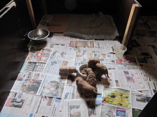 Så er hvalpene blevet 3 uger og i naturen ville de så småt begynde at kikke lidt ud af hulen. Så nu har vi fjernet deres kasse og de ligger nu på et tæppe på gulvet i en af hvalpe afdelingerne, der er aviser man kan tisse på. Nu skal de så lære at gå væk fra tæppet for at besørge, det skal de nok få lært i løbet af en uges tid. De har dog nemt ved at fare vild i rummet og så må vi jo lige hjælpe dem tilbage på tæppet. De er begyndt at få tilbud lidt opblødt tørkost, det er spænnende som i kan se på billederne nederst på siden i galleriet…