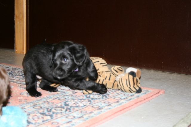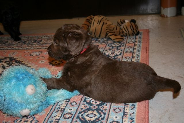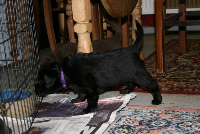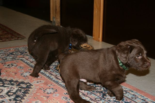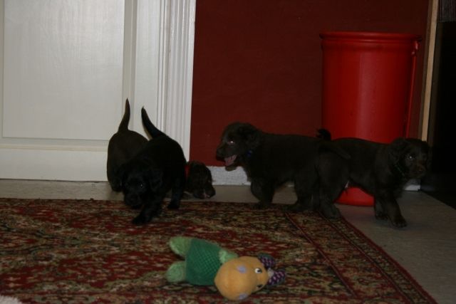 Hvalpene bor nu permanent uden for i en af de meget store hvalpegårde på ca 400m2 og så har de en opvarmet hytte at gå ind og sove i. De nyder al pladsen og muligheden for rigtig at lege hund. De kommer med på små ture rund om på ejendommen og lære at forholde sig til forskellige omgivelser. De kommer naturligvis med ind og lege når vi ikke kan lege ude pga vejret. Når de er indenfor er de renlige for de har nu allerede glem at man kan besørge indendør, deres toilet er jo græs og jord. Men hvis man glemmer at lukke dem ud hver 15-25 min ja så bliver de jo nød til at gøre det på gulvet, men VI glemmer det ikke 😉