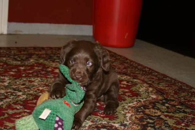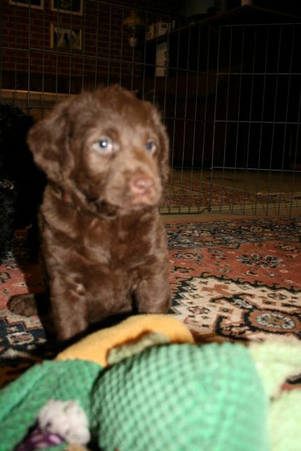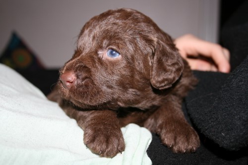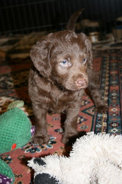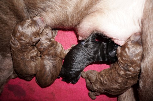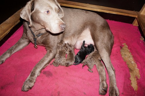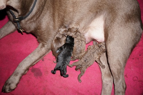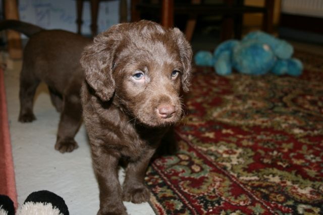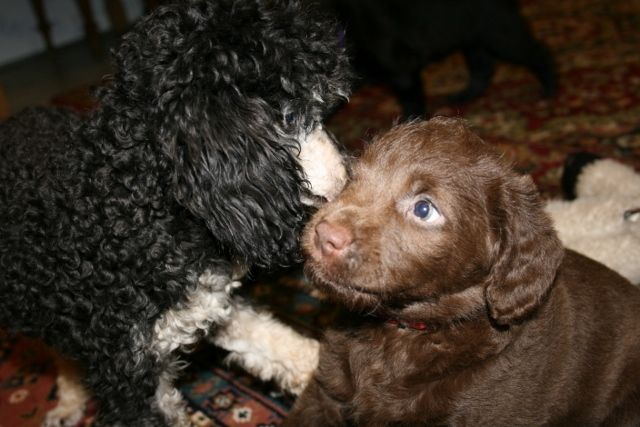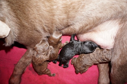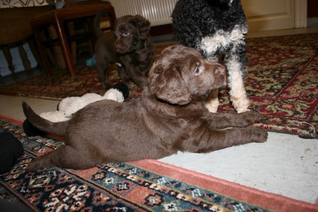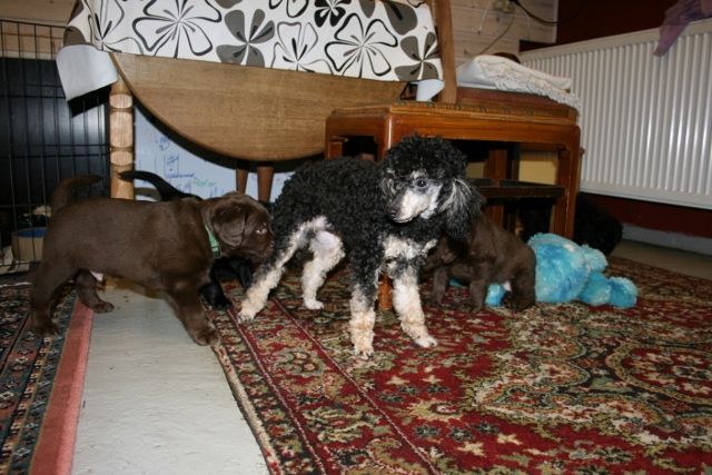 Vores sølvfarvet Labrador “Porsche” som har Tysk stambog, har fået hvalpe med vores harlekin farvet (hvid med grå/sorte områder) Toy Puddel “Gismo”, han har i øvrigt også Tysk stambog. Begge forældres “farver” er grunden til at de ikke er godkendt i Danske stambogsførende klubber. Men de er godkendt i mange andre landes klubber incl Tyskland, dog ikke i FCI regi.