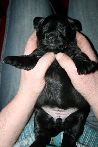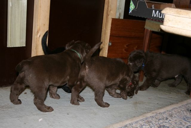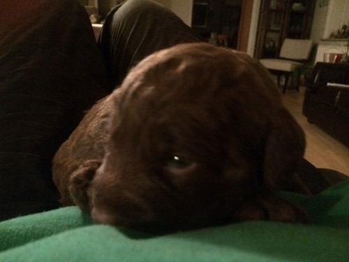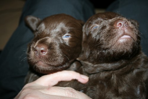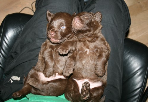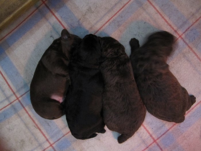 I tænker måske “hvad er de for nogle, hvordan er de”…jo de er smadder søde, de prøver at putte hele vores ansigt ind i deres mund, altså de åbner der mund helt op og prøver at sluge vores ansigter, de slikker os uhæmmet i munden og i øjnene og i næsen. De aner med andre ord ikke hvad de laver, alt er tilfældigt. Man kan ikke fornemme deres endelige personlighed, det træder først igennem ved 6-7 uger alderen. Så den livligste kan blive den rolige om nogle uger. Men lige nu virker de 4 hvalpe meget ens. De kan gå få skridt, men deres øjne fungere ikke rigtigt endnu. De er kun vågen få minutter ad gangen endnu.