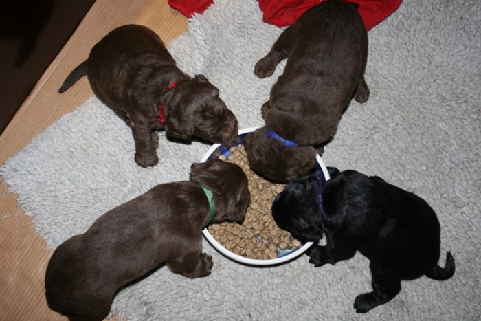 Nu er hvalpene begyndt at interessere sig for opblødt tørkost 🙂