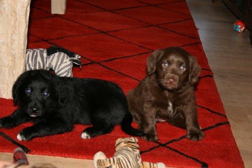 De to hvalpe er nu 6 uger. Volvo den sorte han er en robust dreng, men har et blød væsen ligesom mor Tess, vi kalder dem “lidt konflikt sky” …de gider ikke problemer, så de laver ofte ikke den samme fejl to gang. Den brune tæve er mere fremme i skoene, hun er lidt fræk, hun er også mere eventyr lystende og alt skal prøves. De er dog meget unge og de udvikler deres personlig meget mere fremover, bare på de næste 2 uger sker der rigtig meget…