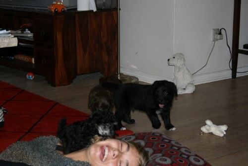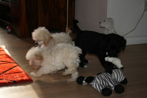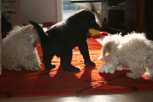 Volvo leger med de to små Toy puddel hvalpe. Dem kan han lige styre 😉 Eller er han jo en af de små her ude med hans 3,5 kg, alle de andre doodler vejer mere end ham og er en del ældre, men pudlerne vejer kun ca 1 kg, men de er doddelt så gamle som ham..
