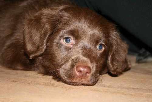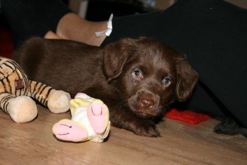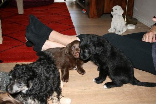 Vores brune Labrador Tess har fået 2 hvalpe sammen med vores harlekin farvet Toy Pudlen Gismo.