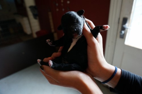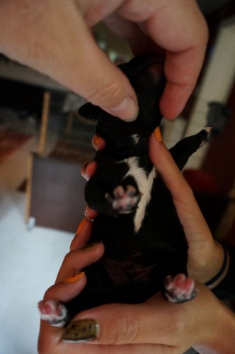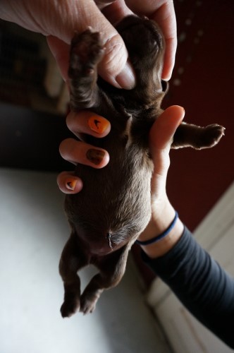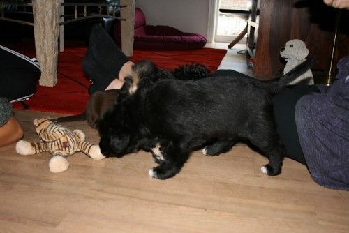 Tess fødte 4 hvalpe, desværre var det kun de to af dem der kom levende ud. En brun tæve med meget lidt hvidt på en bagpote og et prik på brystet og en sort han med mere hvidt på poterne og brystet. Mor Tess og de to hvalpe har det super.